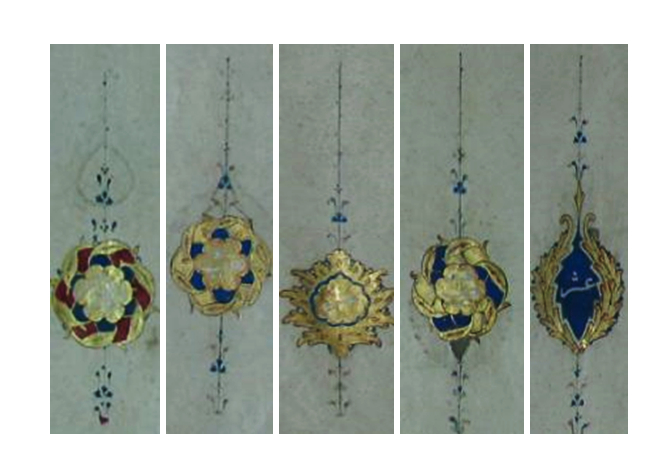 وفي طُرَر أوراقها رُسِمَت الأجزاءُ والأحزابُ وأنصافُها والخُمُوسُ والعُشُورُ والسّجداتُ، بأشكالٍ مختلفة وألوان متعدِّدة، على هيئة شُموسٍ مُصغَّرة وأوراق نباتية مذهَّبة مُذيَّلة، كُتِب فيها البيانُ بالأبيض.
