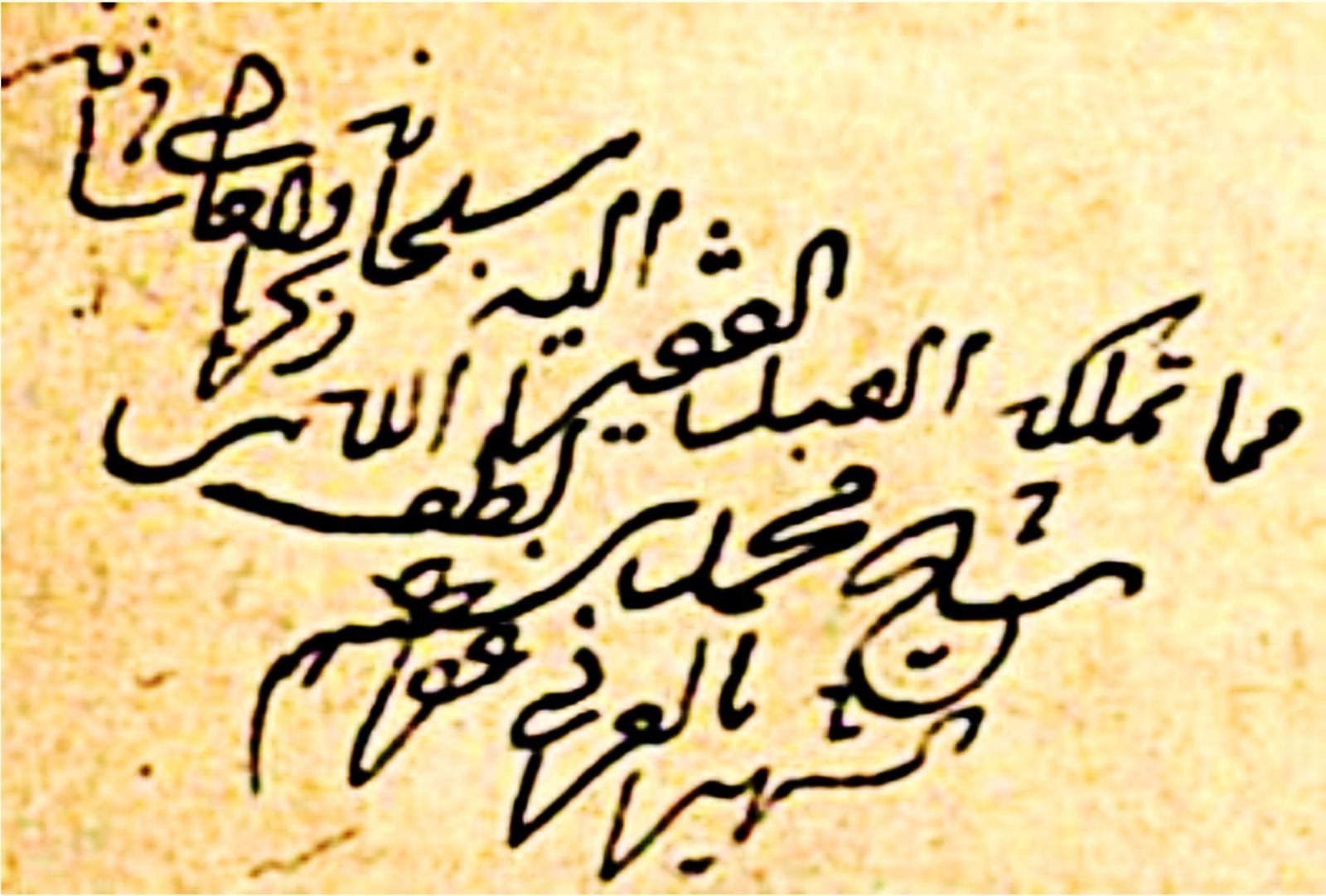 «الحمد لله. هذه النسخة الشريفة العظيمة الجليلة نسخة المؤلف -رحمه الله تعالى- التي أقرأها بمكة المشرَّفة، والشيخ جلال الدين المرشدي وبنوه وغيره يسمعون من لفظه الشريف وفي أثنائها مواضع كثيرة بخطِّه الشريف، والكراس الأخير كلّه بخطه أيضًا والتبليغات التي في الهوامش لا تُحصَى؛ فحينئذ يجب أن يُعلَم قدرها ويُعتمد عليها وتُراجع عند اختلاف النُّسَخ وأشباهها فإنها متأخرة عن نسخته التي أقرأها بمدينة (برصة) -وأولاده الكرام وغيرهم يسمعون من لفظه الشريف- باثنين وعشرين سنة، فإني قد وقفتُ على تلك النسخة وتشرفتُ بمطالعة أكثرها، ولله الحمد، فوجدته -رحمه الله- قد زاد في هذه النسخة على تلك أشياءَ كثيرة، والذي ظهر لي -والله أعلم- أن هذه النسخة التي استقرَّ عليها رأيُه السديد وتأليفُه السعيد، جزاه الله تعالى خير جزاء، وحَشَرَنا في زمرته ببركة القرآن المجيد مع الذين أنعم الله عليهم من النبيين والصدّيقين والشهداء والصالحين وحَسُن أولئك رفيقًا، آمين يا رب العالمين. قال هذه الأحرف وكتَبها بيده الفانية مالك هذه النسخة المبجَّلة الفقير الحقير المعترف بالعجز والتقصير (أبو شاكر محمد بن علي) خُوَيدِم كتاب الله والمستجير برسول الله، لَطَفَ الله به وبأُمّة محمد في الدنيا والآخرة، آمين آمين آمين. سنة 1077».