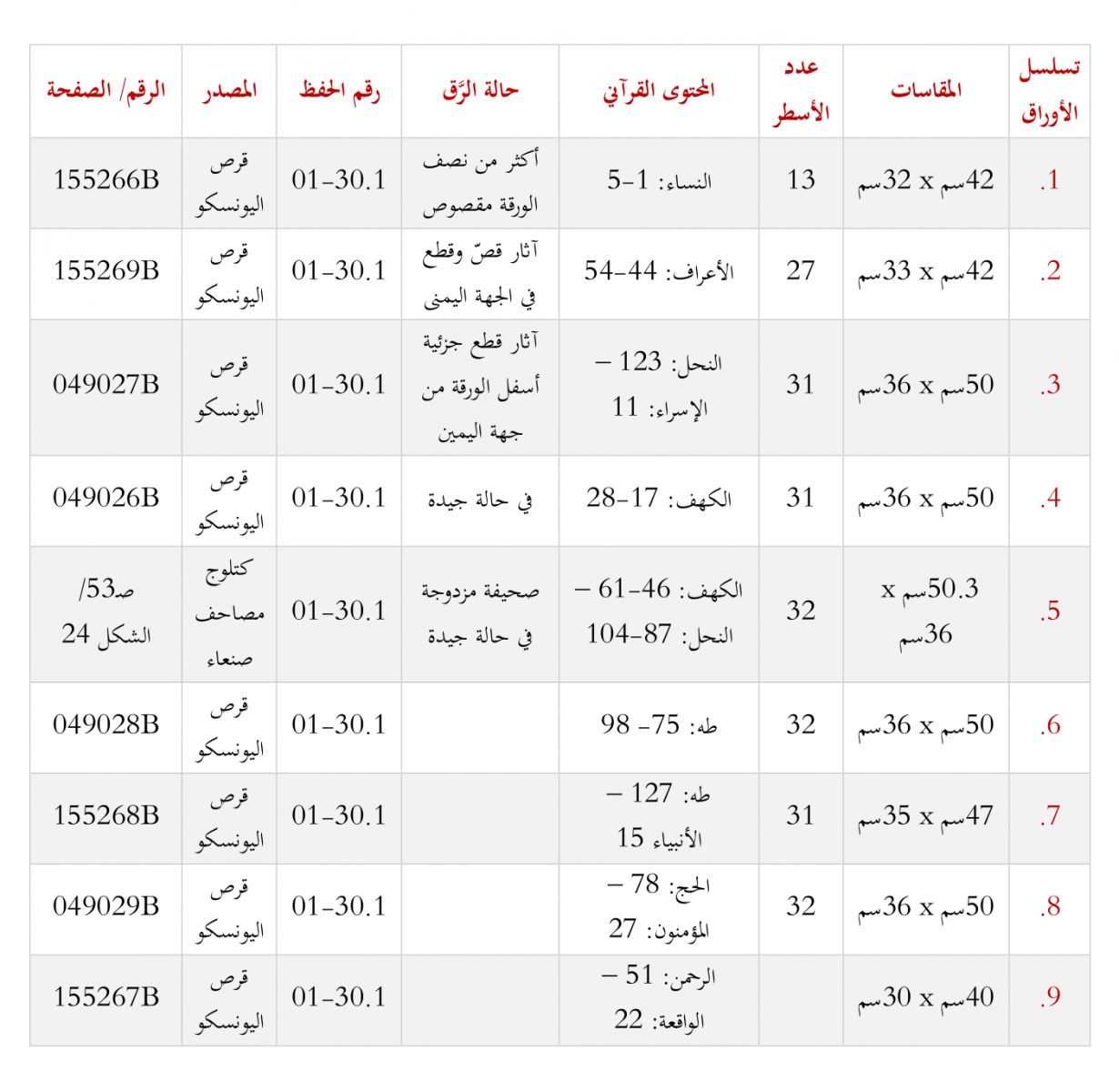 يُظهر الجدول الآتي تفاصيل الأوراق المنشورة للقطعة (01-30.1) من مجموعة صنعاء[7]:
