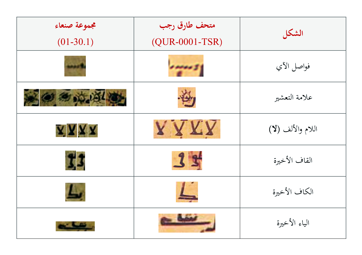 اخترنا للمقارنة البصرية مجموعة من الرموز الدالة؛ مثل: فواصل الآي وعلامة التعشير، وبعض الأحرف الأبجدية المميزة في طريقة رسمها كالقاف والكاف والياء التي تأتي في آخر الكلمة؛ كلّ ذلك للتدليل على أنّ الورقة القرآنية المبكّرة المكتوبة بالخط المائل من متحف طارق رجب تنتمي فعليًّا إلى المصحف المحفوظ بدار المخطوطات اليمنية برقم (01-30.1).