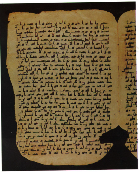 صورة مكبرة للورقة القرآنية من متحف طارق رجب بالكويت. المصدر: موقع برانون ويلر www.usna.edu/Users/humss/bwheeler/quran/maili.html