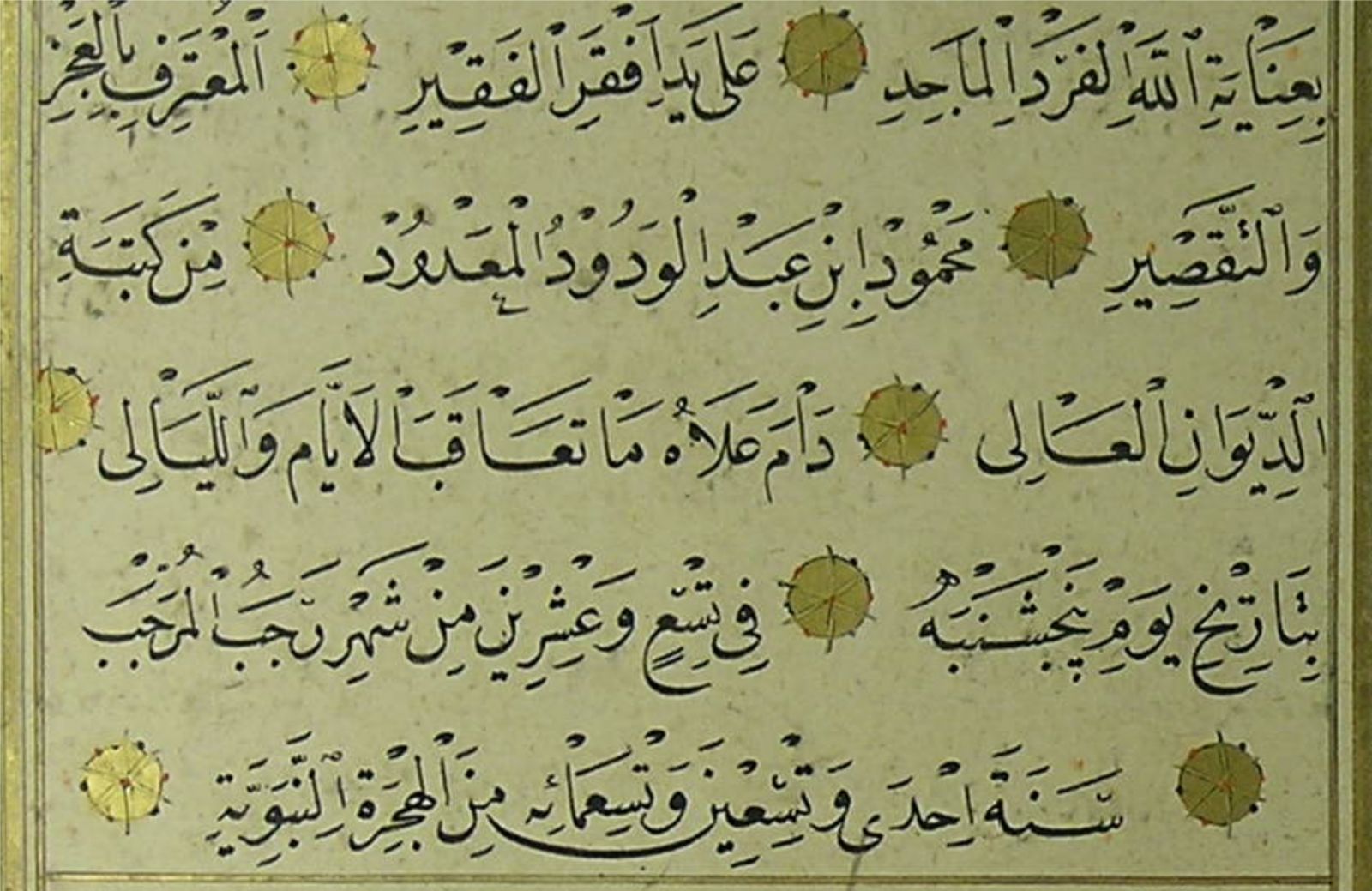 وقد كتبت هذه النُّسخة الشَّريفة بقلم «محمود ابن عبد الودود» أحد كتبة الدِّيوان العالي للسَّلطنة العثمانية في زمن السُّلطان مراد خان الثالث، في تاريخ يوم الأربعاء في تسع وعشرين مضَين من رجب بعد الهجرة المشرَّفة بتسع مئين وإحدى وتسعين.