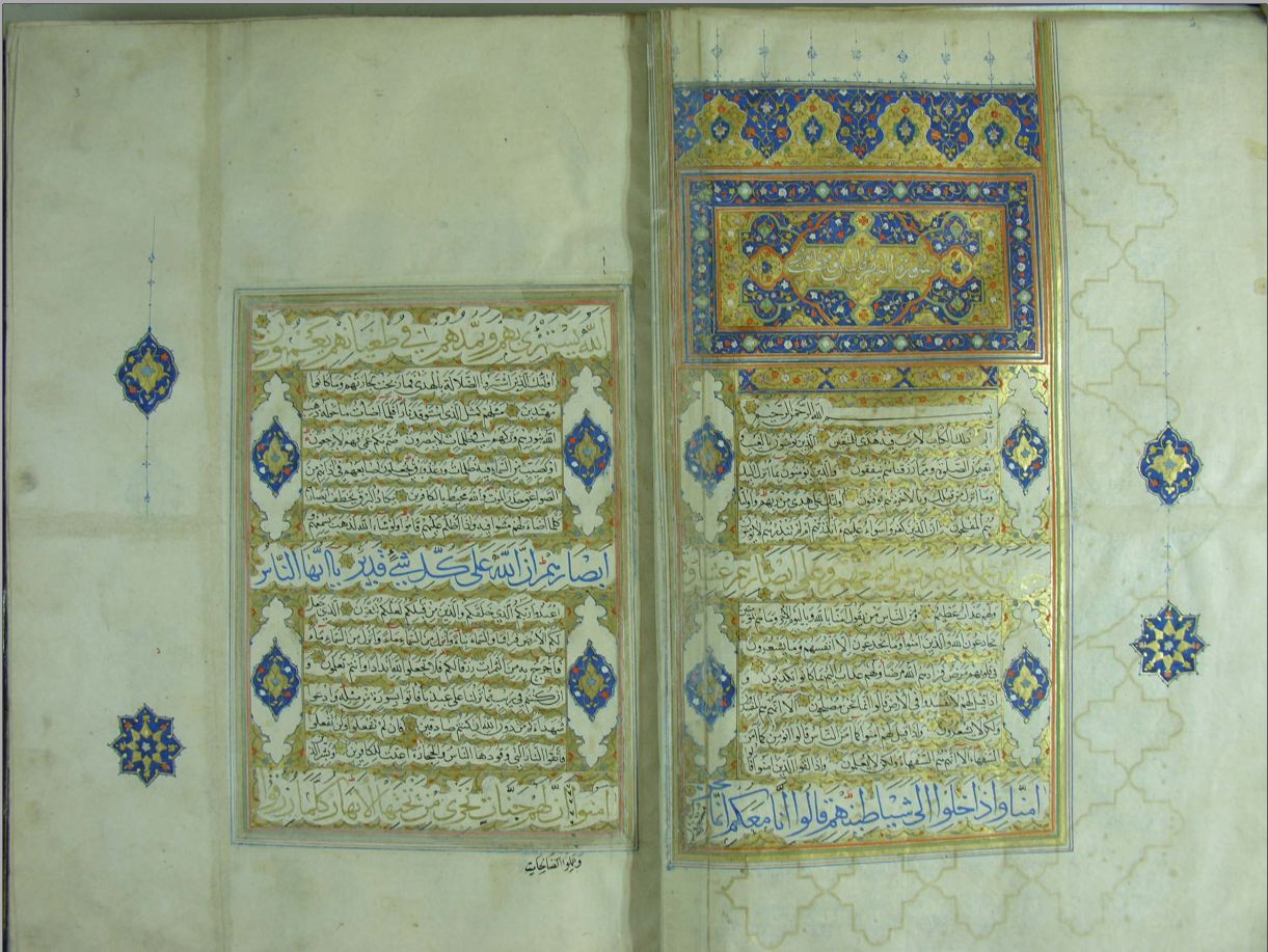 ثُم لوحة استهلاليَّة مزركشة بالشكلِ النباتي عظيمة المَخبَر مهيبة المنظر لا تخرج إلا من يدِ رجُلٍ مِفَنٍّ، كتب على ورقتيها سورة الفاتحة بخطّ ثُلثٍ جليّ بحِبر أبيض مُضِيٍّ، داخل صندوق مطليٍّ بالذهب مُنحَنِي الأضلاع، تحيطه زُرقةٌ وزخرفات ذهبيّة معشَّقة تتمايَز عن بعضها بدوائر وزوايا، يحيط بها إطار محشوّ بالضفائر الزرقاء الفاتحة المنقَّطة بالبياض والحُمرة، يكسوها مربَّعات متقابلة على أشكالِ مصابيح متداخلة بلَوْنَيها الأزرق والمُذهَّب، ثُم تُوِّجَت اللوحة من طرَفَيها بتاجَين عظيمَين في المنتصف وذُيول زرقاء ناعمة، وأرضيَّةُ اللوحة يكسوها الزَّهر وأغصانه الملتوية ملوَّنة بالذهب والبياض والحُمرَة.