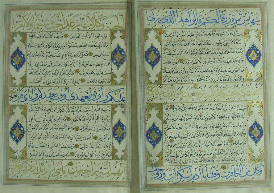 ثُم لُوِّن بياضُ ما بين السطور وعلى جوانبها بالذهب، وزُيِّنت الصفحة كما في كلِّ أوراق النُّسخة بثلاثة سطور كبيرة، بخطّ الثُّلث الجليِّ، بلون ذهبيٍّ وأزرق، وبينهما باقي السطور بخَطٍّ صغير أسود، وعلى جوانبها قلائد مزركشة بالزُّرقة والذهب، ويُحيطها أركان مذهبة، في كلِّ صفحةٍ أربعةُ قلائد بقسمَيها الظاهرَين، وأُطِّرَت جميع أوراقها بالذّهب والخُضرة والحُمرة.