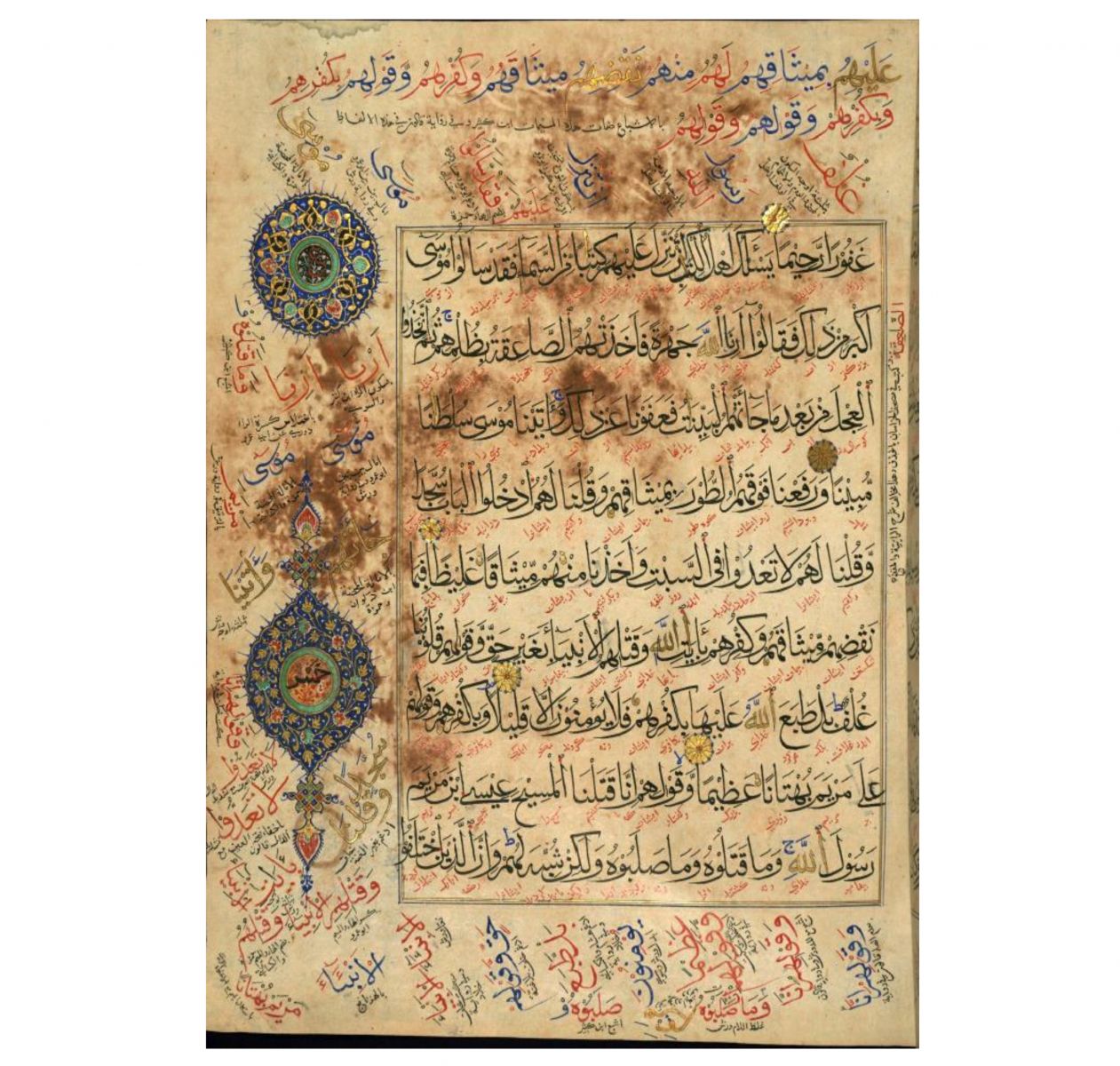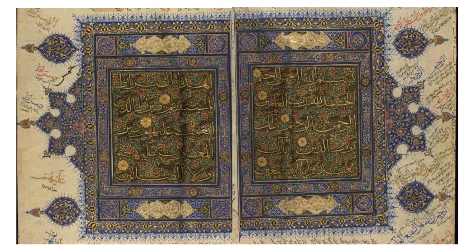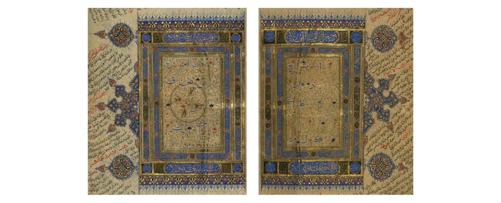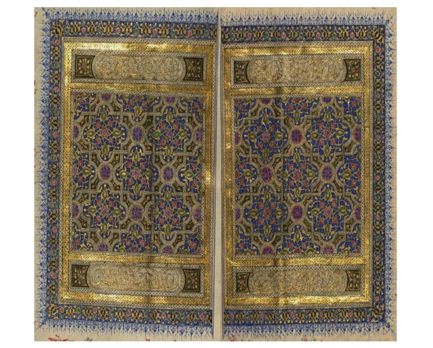 ثم ورقة مزخرفة بالأشكال النباتية والهندسية المتداخلة المتعانقة الملونة بالزرقة والحمرة والخضرة المؤطّرة بالذهب والزرقة والأشكال النباتية، بأعلاها كتيبتان داخلهما بالذهب: {إنه لقرآن كريم في كتاب مكنون لا يمسه إلا المطهرون تنزيل من رب العالمين}.