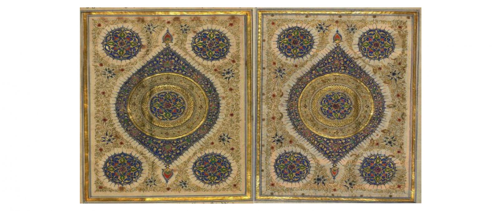 ثم ورقة فيها الزخرفةُ عينُها إلا أنه استَبْدَل بالشمسية لوحةً مزخرفةً على شكل قلادة كبيرة بمنتصف الورقة، في زوايا الورقة أربع قلائد صغار بينها وبينهم أرضية ممتدة من الزهر وورق الشجر المذهّب، يحيطهم إطار مذهب ثخين.