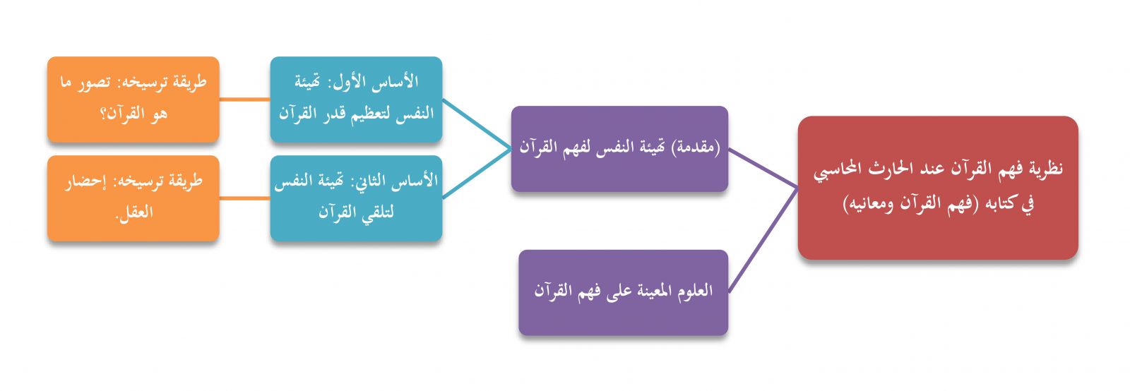 وبعد هذا الاستنكار على المنشغلين عن القرآن ولم يُحضِروا عقلوهم؛ نكون قد انتهينا من بيان معالجة الحارث المحاسبي -رحمه الله- لتهيئة النفس لتلقّي القرآن، والرسم الآتي يوضح حاصل رؤية الحارث المحاسبي ككلٍّ لفهم القرآن (مع تفصيل في مدخل تهيئة النفس لفهم القرآن):
