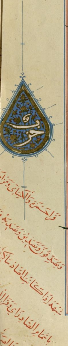 ولنهاية نصف الحزب دائرة بيضاوية، مواصفاتها مشابهة، لكن جعل لونها الداخلي أزرق وزخرفها بماءِ الذّهب ويسيرٍ من الحُمرة.