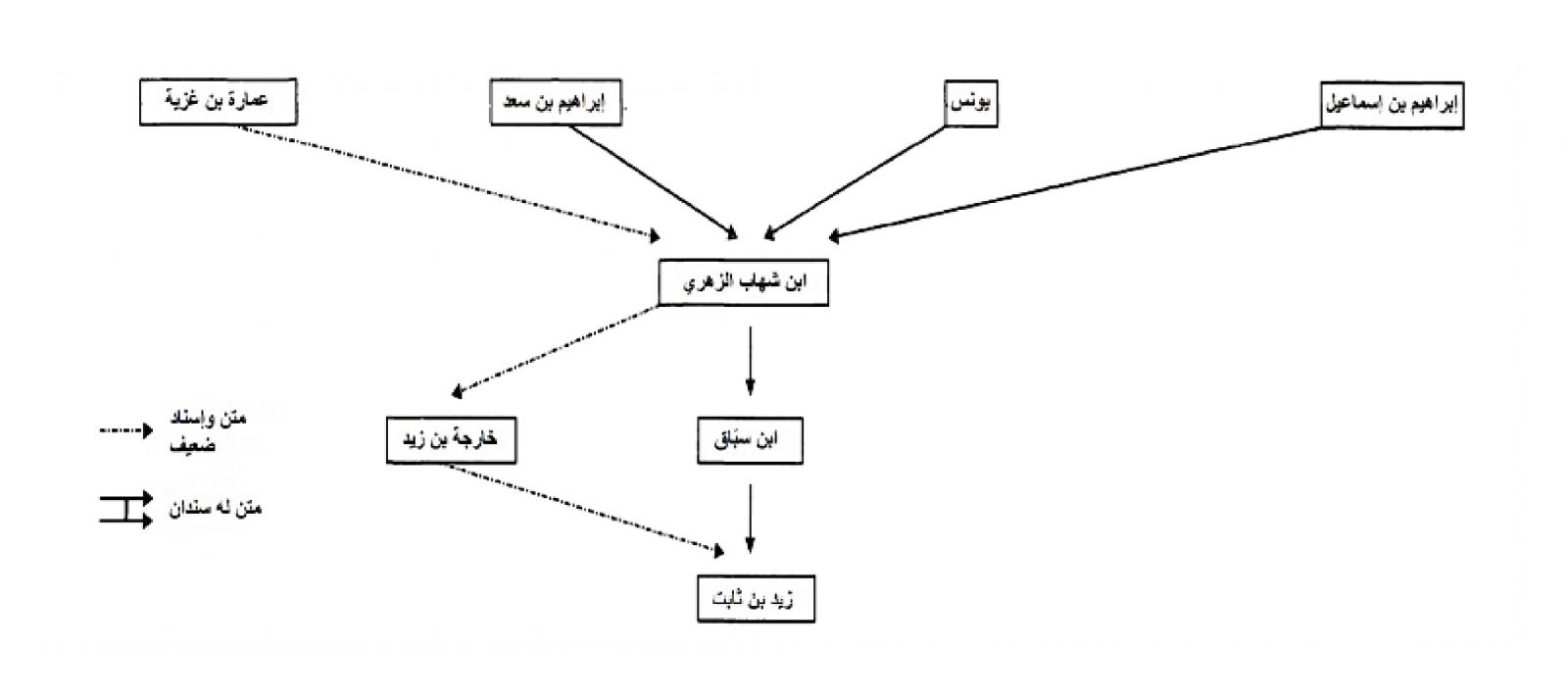 ملاحظة يجب الانتباه لها: اعتبر موتسكي الطريق بين زيد بن ثابت وابن شهاب طريقًا مفردًا به (ابن السباق) فقط؛ لأنه استثنى الراوي الآخر وهو خارجة بن زيد بن ثابت، وسيأتي الكلام عن هذه النقطة بالتفصيل فيما بعد حين نعرض لتقويم البحث[9].