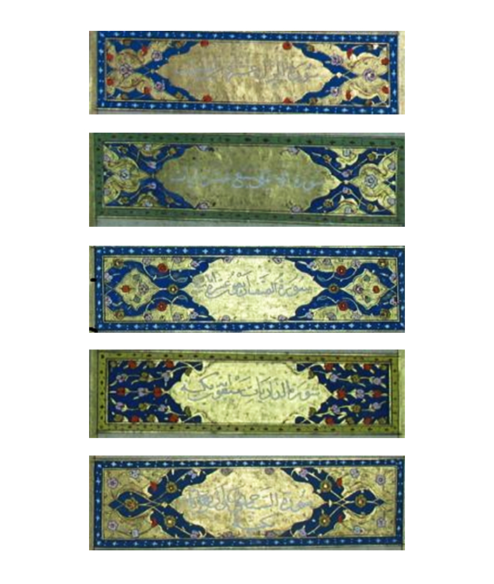 وأُطِّرَت جميعُ الأوراق بإطارات ذهبيَّة، ثم كُتِبَت فواتحُ السور داخل كَتيبات ذهبيَّة ملوَّنة بالزُّرقة والحُمرة والخُضرة مختلفة الشَّكل والصورة، بخطِّ ثلثٍ أبيض واحد، برسمات بديعيَّة متنوعة، وانتهَت رؤوسُ الآيات بدوائر مذهَّبة مضيئة.
