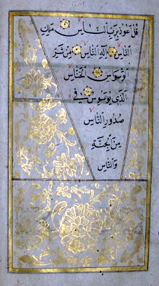 ثم اختُتِمَت بسورة الناس على شَكْلِ حَرد مَتنٍ من أعلَى الورقة المؤطَّرَة، يُحيطُه رسمٌ مُزيَّن بالورود المشجَّرة، ملوَّنٌ بالذهب ليُغَطِّي فراغَ بياض الورقة.