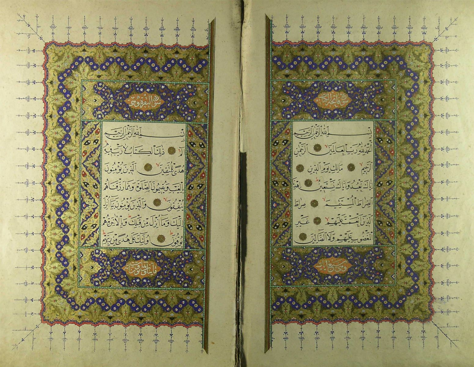 وقد زُخرِفت الورقة الأولى منها -المكتوب عليها سورة الفاتحة والأول من البقرة- بلوحةٍ استهلاليةٍ، مُزركشة بالزَّهر، والأشكال النَّباتيَّة المُتداخلة بتيجان هندسية، على شكل إطارات تحيط بالآيات ملوَّنة بالذَّهب والزُّرقة والحُمرة، مكتوب بأعلاها بخطِّ ثُلث جليٍّ بلون أبيض على أرضية بُنيَّةٍ منقَّطة اسم السورة وبأسفلها عدد آياتها ضمن كتيبة مؤطَّرةٍ بالزَّيتي.