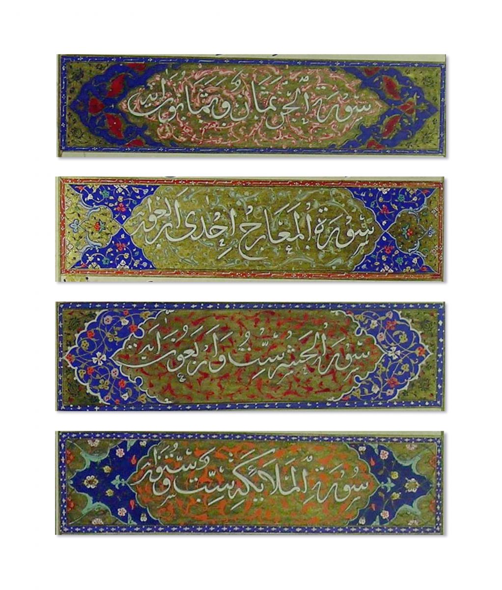 وقد أُطِّرتِ الأوراقُ بإطارٍ ذهبيٍّ ثخين، وكُتبت أسماءُ السّور وعددُ آياتها على رأس كلِّ سورة بكتيبة مزخرفة بزخرفات مختلفة بين كلِّ كتيبةٍ وأخرى ملونة بالذَّهب والزُّرقة ومؤطَّرة بالحُمرة.