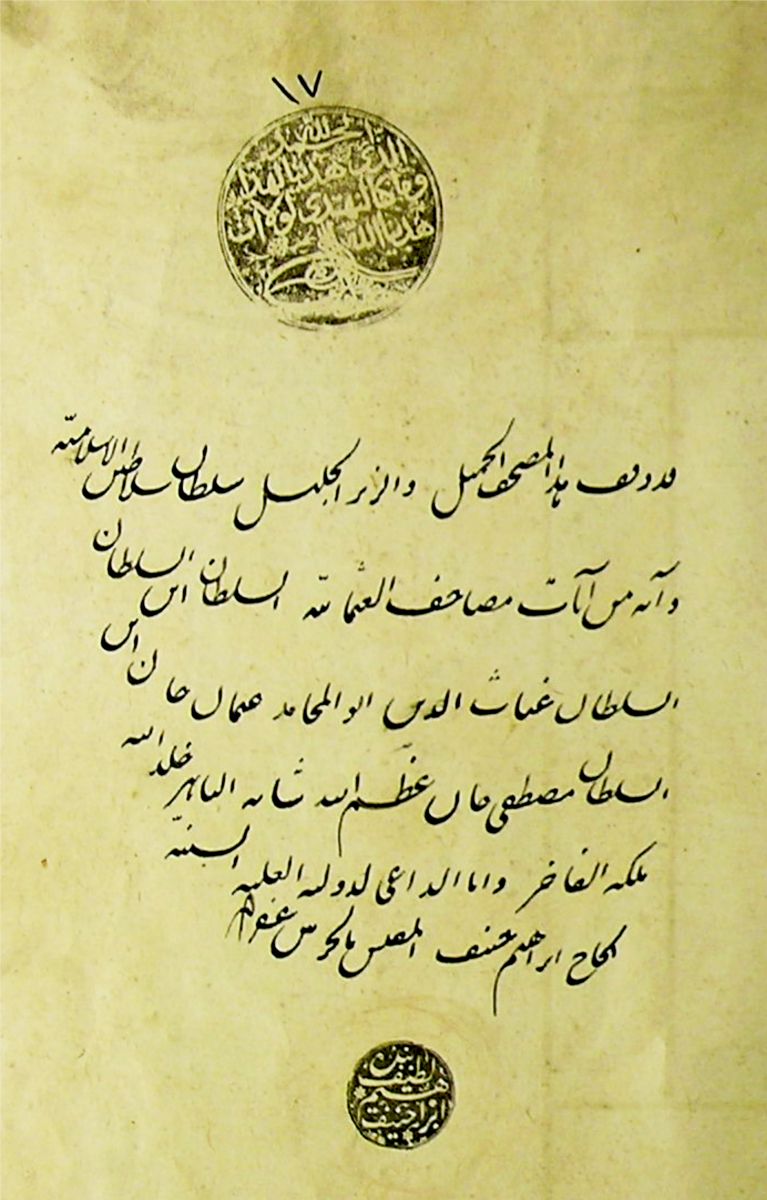 وعليها وقف السُّلطان عثمان، ونصّه: «قد وقفَ هذا المصحفَ الجميل والزّبر الجليل سلطان السَّلاطين الإسلامية وآية من آيات مصاحف العثمانية، السُّلطان ابن السُّلطان، السُّلطان غياث الدين أبو المحامد عثمان خان ابن السُّلطان مصطفى خان عظّم الله شأنه الباهر، خلَّد الله ملكه الفاخر، وأنا الداعي لدولته العليَّة السَّنية الحاج إبراهيم حنيف المفتش بالحرس غفر له». يتلوه خاتم نُقِشَ بداخله اسم ناظر الوقف. وخُتِمَ بأعلاه بخاتَمِ السُّلطان وبه «الحمد لله الذي هدانا لهذا وما كنَّا لنهتدي لولا أن هدانا الله».