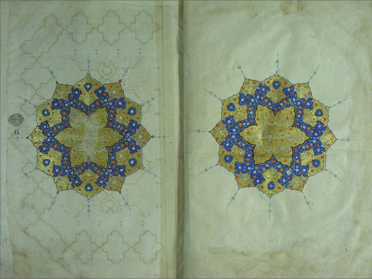 ثُم لوحة استهلاليَّة مزركشة بالشكلِ النباتي عظيمة المَخبَر مهيبة المنظر لا تخرج إلا من يدِ رجُلٍ مِفَنٍّ، كتب على ورقتيها سورة الفاتحة بخطّ ثُلثٍ جليّ بحِبر أبيض مُضِيٍّ، داخل صندوق مطليٍّ بالذهب مُنحَنِي الأضلاع، تحيطه زُرقةٌ وزخرفات ذهبيّة معشَّقة تتمايَز عن بعضها بدوائر وزوايا، يحيط بها إطار محشوّ بالضفائر الزرقاء الفاتحة المنقَّطة بالبياض والحُمرة، يكسوها مربَّعات متقابلة على أشكالِ مصابيح متداخلة بلَوْنَيها الأزرق والمُذهَّب، ثُم تُوِّجَت اللوحة من طرَفَيها بتاجَين عظيمَين في المنتصف وذُيول زرقاء ناعمة، وأرضيَّةُ اللوحة يكسوها الزَّهر وأغصانه الملتوية ملوَّنة بالذهب والبياض والحُمرَة.