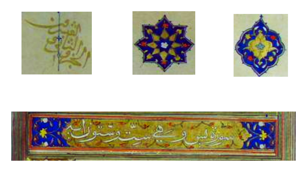 ثُم شمسيَّتان مُشرِقتان متوزِّعٌ عليهما آية كريمة بالحِبر الأبيض بخطّ ثُلث جليّ، على أرضيّة ذهبيّة مضيئة، داخل شكلٍ مُقَبَّب مُسدَّس الأضلاع يحيط بها تِيجان مقلوبة ملوَّنة بالأزرق تعلوها تِيجان ذهبية مذيَّلة، وتَحتَضِن الشمسيَّتَيْن أزهارٌ وفروع منحنية تعانق الأشكال الزُّخرفية بشكلٍ بديعٍ ملوَّنة بالبياض والحُمرة والصُّفرة.