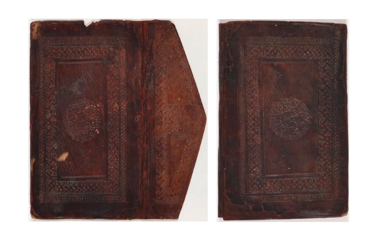 جُلِّدت هذه النسخة بتجليد قديم أحمر قرمزي من الجلد، في داخله ثلاثة إطارات دقيقة وثخينة على شكل مستطيلات تحوي بعضَها، مُزخرفةٌ زخرفةً نباتيةً مضغوطةً، تتوسطها دائرة مزخرفة بالشكل النباتي على هيئة قلادة، ويتصل بوجهه الآخر لسانٌ عريض مزخرف زخرفةً نباتيةً مضغوطةً.