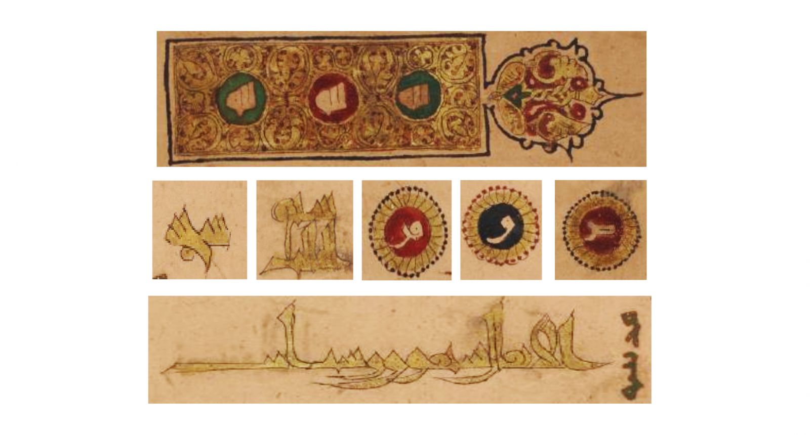 ثم ابتدَأ النُّسْخة بلوحة استهلالية على شكلِ كتيبة مُذهّبة مُزخرفة بالشكلِ النباتي، يتوسَّطها ثلاث دوائر مكتوبٌ بها لفظ الجلالة بالكوفي المذهّب، لُوِّنَت كلُّ دائرة بلونٍ مختلِف عن الآخر، تتصل بها قلادة مزخرفة بالأشكال النباتية الملونة بالذهب والحُمرة، وزَخرَف فواتح السور والأسباع والسجدات بالذهب بخط كوفي يختلف عن النصّ، وزخرف العُشور بدوائر ملونة بالحُمرة والخُضرة حولها الذهب، ومنقَّطة بالحمرة من جوانبها.