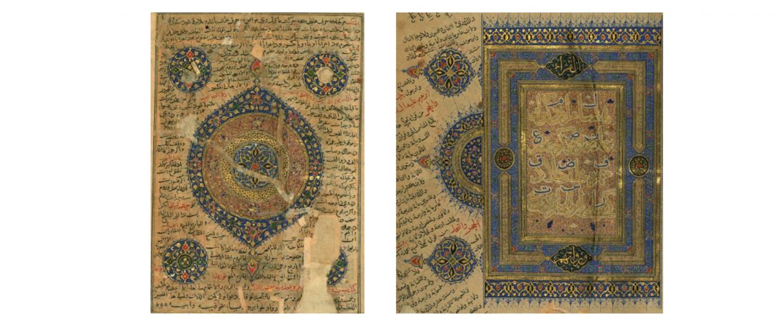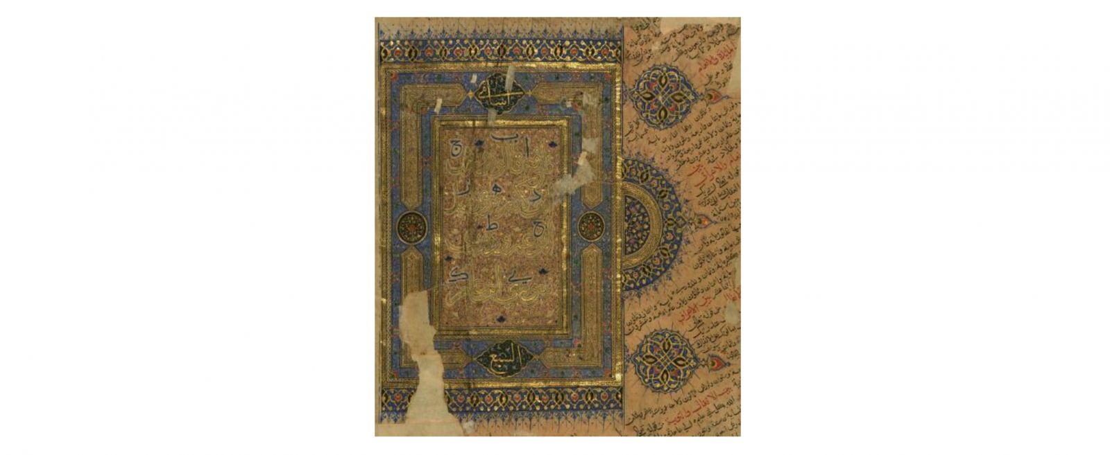 ثم ورقة مزخرفة بالأشكال النباتية والهندسية المتداخلة المتعانقة الملونة بالزرقة والحمرة والخضرة المؤطّرة بالذهب والزرقة والأشكال النباتية، بأعلاها كتيبتان داخلهما بالذهب: {إنه لقرآن كريم في كتاب مكنون لا يمسه إلا المطهرون تنزيل من رب العالمين}.