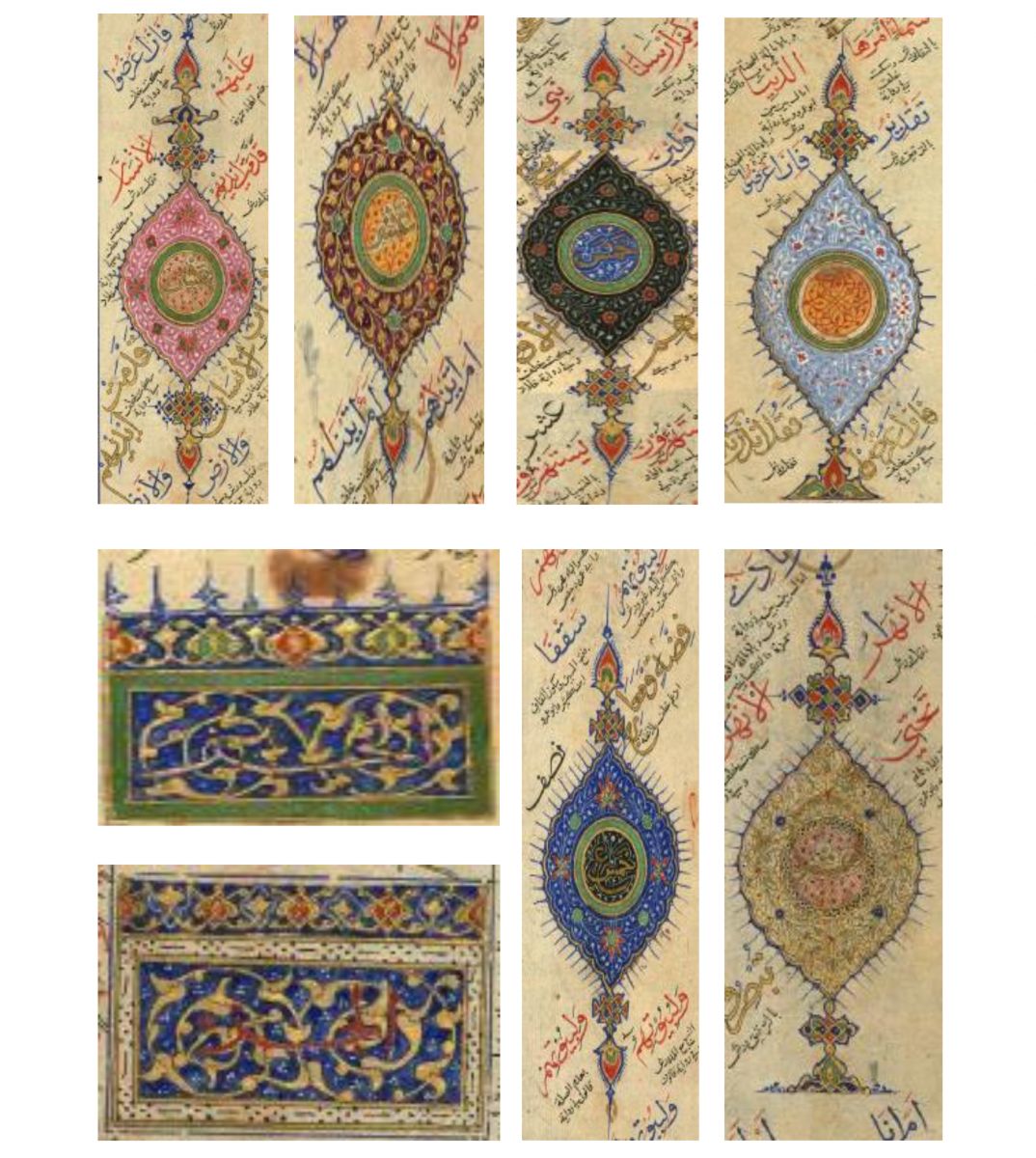 ورُسمت رؤوس الآيات بدوائر مطموسة بالذهب مجنَّحة بأعواد زرقاء دقيقة، يتوسطها نقطة حمراء، ثم قلائد وصناديق متوَّجة مزركشة مذهبة بالشكل النباتي الهندسي الملون بالذّهب والحمرة على خلفية زرقاء، بأشكال مختلِفة بديعة بها الخُموس والعُشور والأجزاء والأحزاب وأنصافها، وأُطِّرَت كلّ الأوراق بإطار مذهَّب وأزرق دقيق.