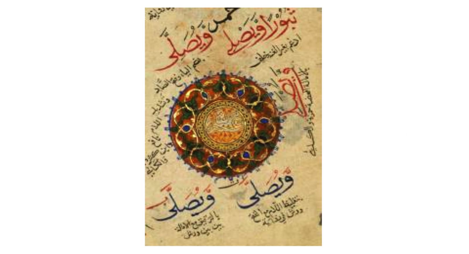 ثم ورقة فيها شمسية كبيرة مزخرفة بالذهب والأشكال النباتية على أرضيات ذهبية وزرقاء بأشكال بديعة وزخرفات مصنوعة مذيَّلة، تحيطها أربع قلائد متداخلة الرسم متعانقة الشكل، ملونة بالزُّرقة والحُمرة والخُضرة والذّهَب مزهَّرة، مؤطَّرة بإطار ذهبي عريض.