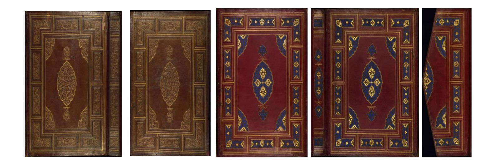 ثم ورقة فيها الزخرفةُ عينُها إلا أنه استَبْدَل بالشمسية لوحةً مزخرفةً على شكل قلادة كبيرة بمنتصف الورقة، في زوايا الورقة أربع قلائد صغار بينها وبينهم أرضية ممتدة من الزهر وورق الشجر المذهّب، يحيطهم إطار مذهب ثخين.