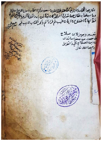 وقد تحقّق ذلك الأمر في هذا المخطوط؛ ففـي نسخة مكتبـة رفاعـة الطهطـاوي كُتِب فـي طُرَّة النسخة:
