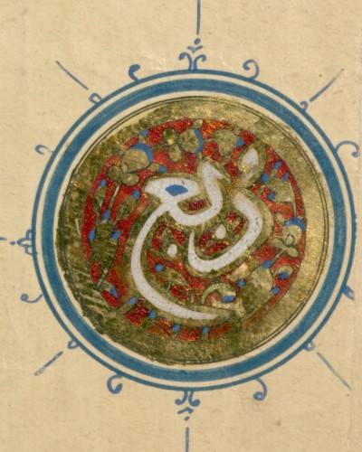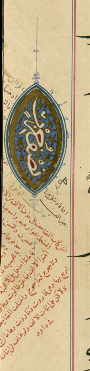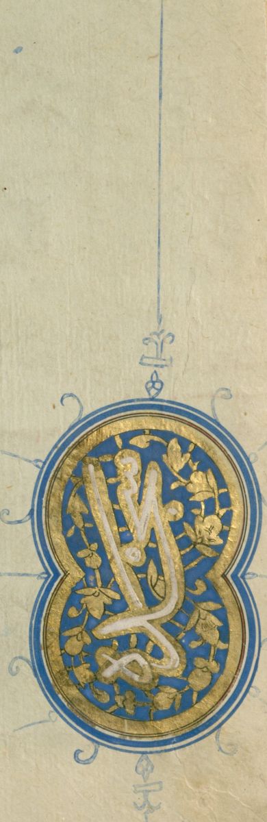 ولنهاية نصف الحزب دائرة بيضاوية، مواصفاتها مشابهة، لكن جعل لونها الداخلي أزرق وزخرفها بماءِ الذّهب ويسيرٍ من الحُمرة.