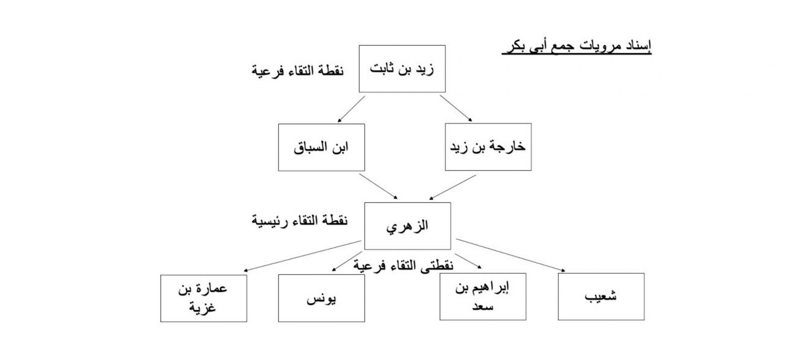 تتقاطع هذه السلاسل الإسنادية كلّها مع راوٍ واحد هو ابن شهاب الزهري (124هـ)، وهو مِن تابعِي المدينة وأحد فقهائها، ويسمَّى تقاطع السلاسل هذه بـ(نقطة الالتقاء)، وفوق هذه النقطة التلاميذ الذين أخذوا الرواية منه: إبراهيم بن سعد، ويونس، ويطلق عليهم (نقاط التقاء فرعية)، وتحت ابن شهاب طُرُق مفردة عن ابن السباق عن زيد بن ثابت.